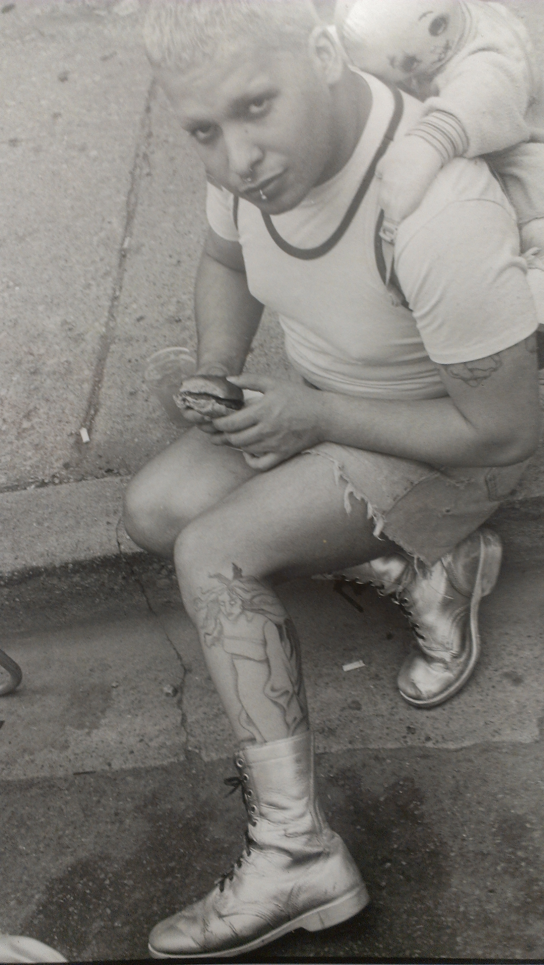 In 1985, Fred Burkhart took a photo – wait, let me re-phrase that in Burkhart-ese – in 1985, a picture was given to Fred of JoJo Baby, a Chicagoan who would come to be as famous as Fred (if not more so) as a fixture of the Chicago nightlife scene, as a world-renowned drag queen and as a dollmaker. JoJo was seated on a curb across from the Chicago Diner, and Fred snapped an image of JoJo enjoying his very first veggie burger, clad in silver Docs, with short hair and tiny earlobes, and about 20% of the ink he now sports.