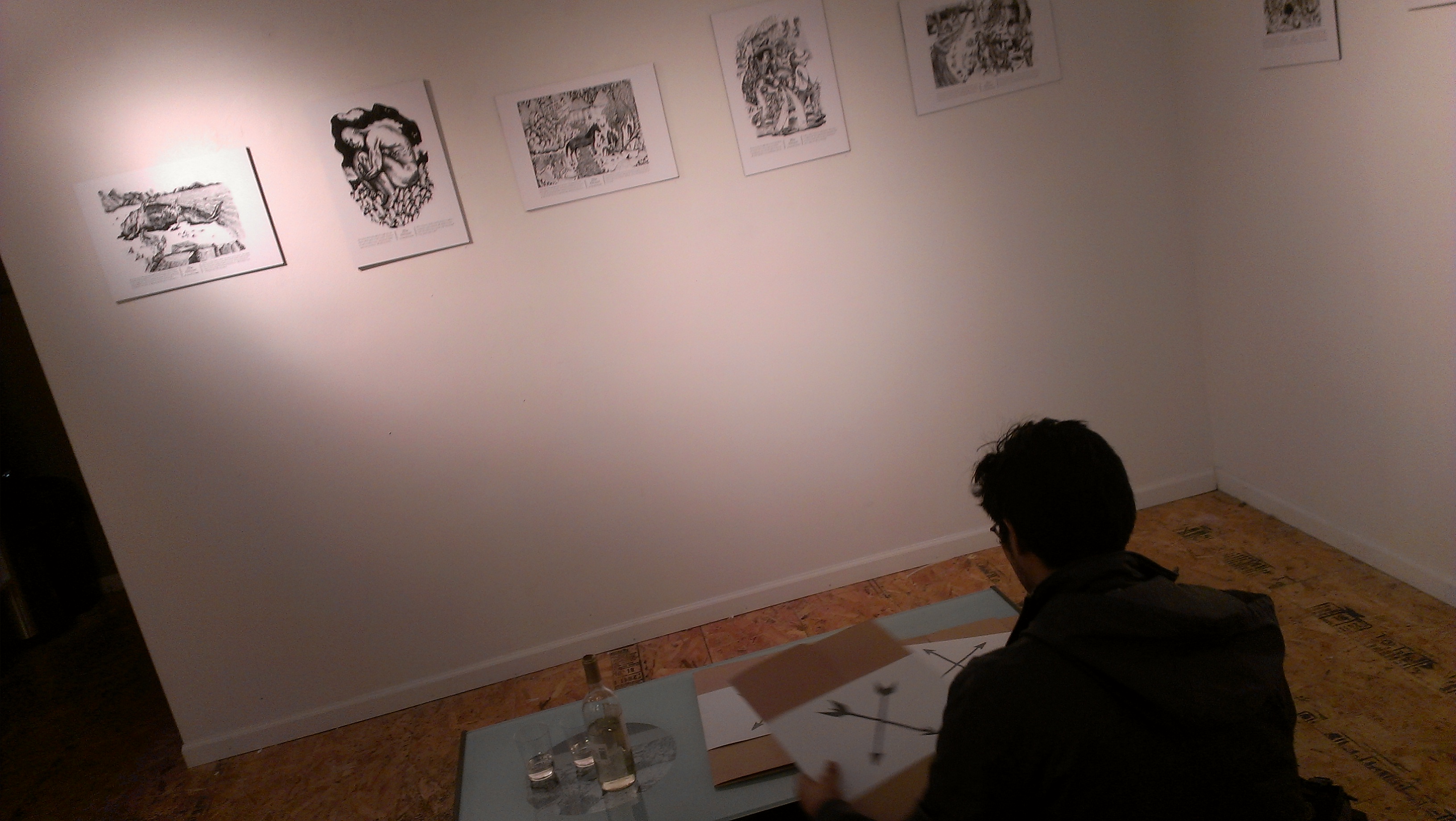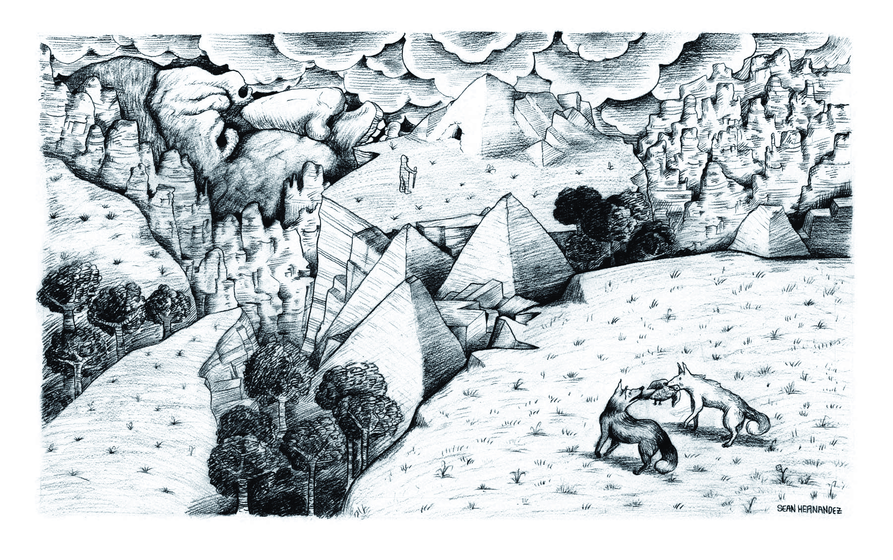 To me, nothing epitomizes this concept more than flying over one of Chicago’s frozen, grated bridges and looking down to see snowflakes twenty feet below you settling into the icy water of the Chicago river. Based on the Chicago Ave. Bridge. Pen; white and black ink; glass shards; digital effects. Orig. size: 11 x 14″ (2016). Available as a print-to-order.